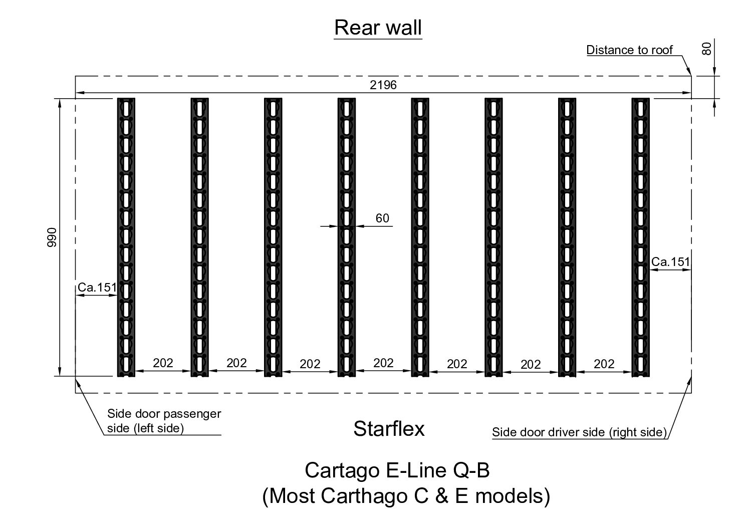 Denne grunnpakken er skreddersydd for Carthago E-Line Q-Bed-modellen og gir en komplett oppbevaringsløsning som utnytter plassen optimalt. Med denne pakken får du alt du trenger for å skape et fleksibelt og tilpassbart oppbevaringssystem i din bobil, slik at du kan holde alt utstyr organisert og trygt under transport.