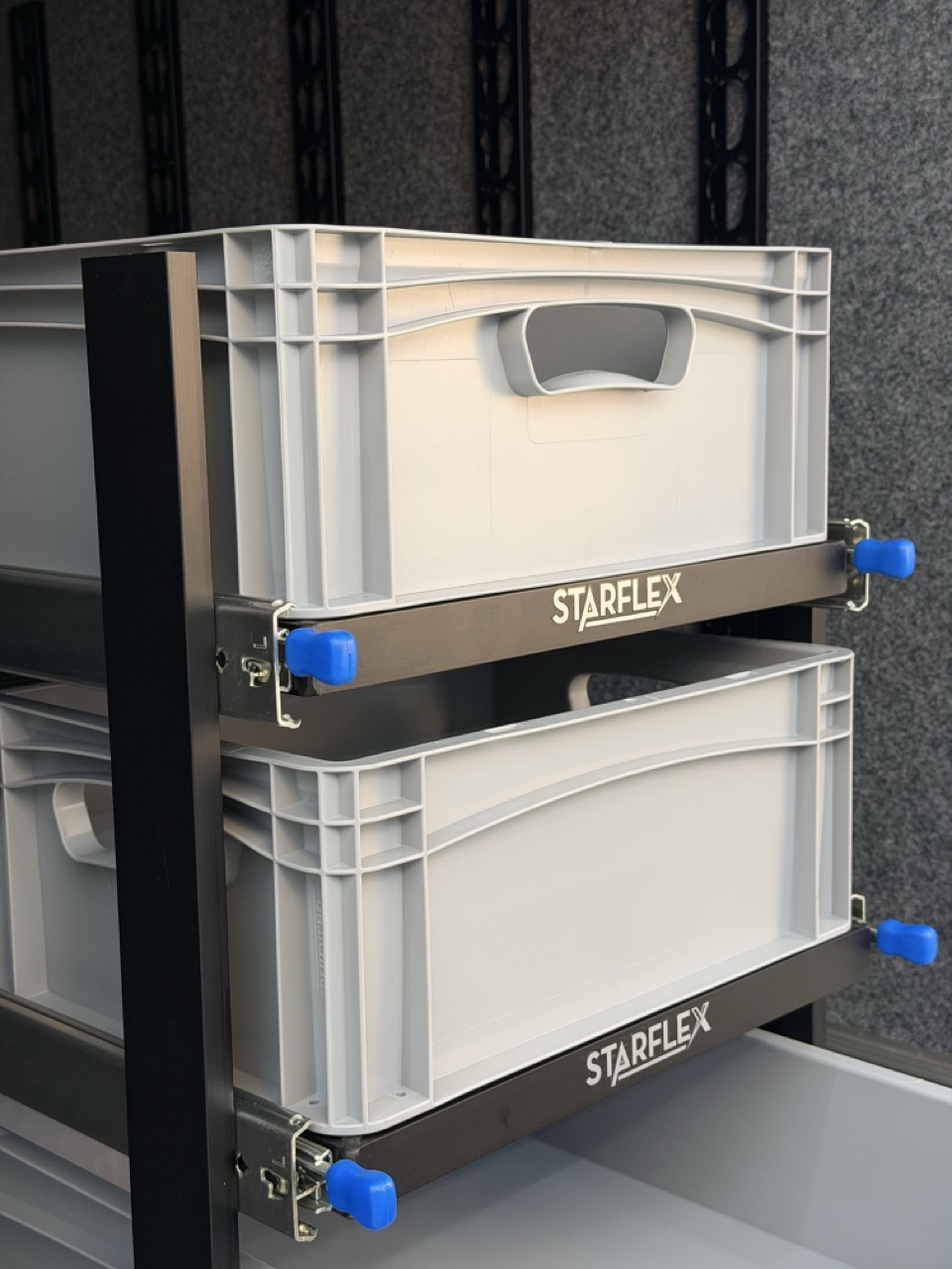 Produktnummer: I/A Kategori: Oppbevaringssystemer Stikkord: Euroboks, euroboks holder, euroboks slider, eurobokser, lagringssystem, oppbevaring, starflex, uttrekksystem